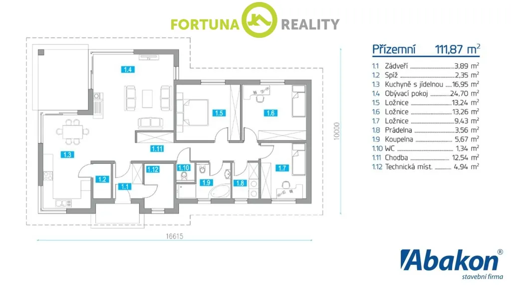 Dům je typu přízemní bungalov 4 + kk a lze jej provést i ve variantě bezbariérové. V přízemí domu se nachází 3 ložnice, 1x samostatné WC, koupelna s vanou, sprchovým koutem, umyvadlem a WC, technická místnost na vytápění a bojler, prádelnu na sušičku a pračku, obývací pokoj spojen s terasou, kuchyní a jídelnou. Kuchyně má samostatnou místnost na spíž.
