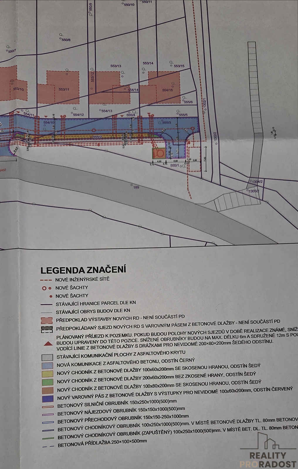 Cena uvedena včetně přípojek ke každému pozemků. Do celkové výměry pozemku je započtena výměra podílu na komunikaci a pozemku na přečerpávačku tlakové kanalizaci (78,5 m2).