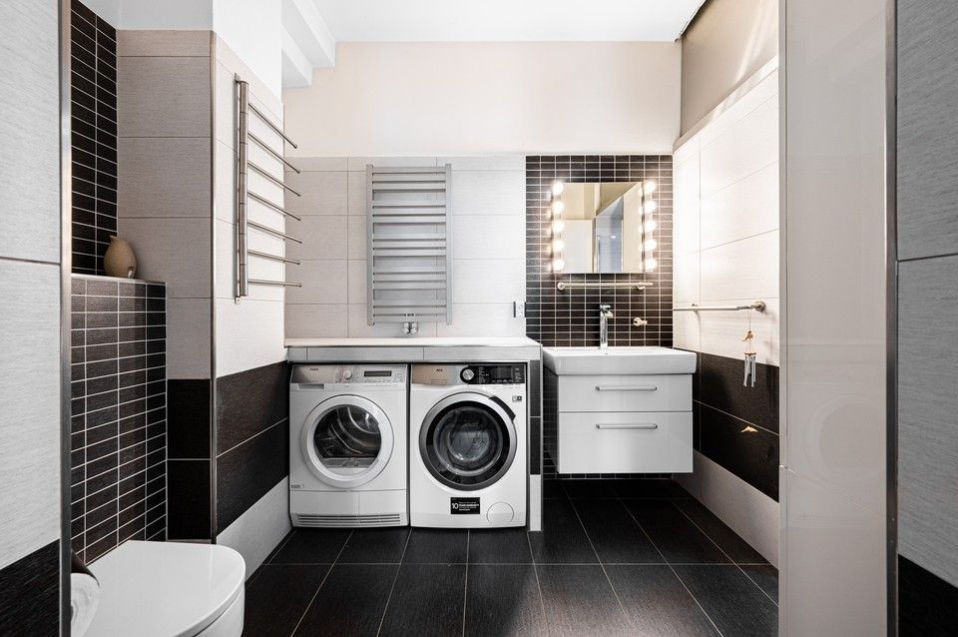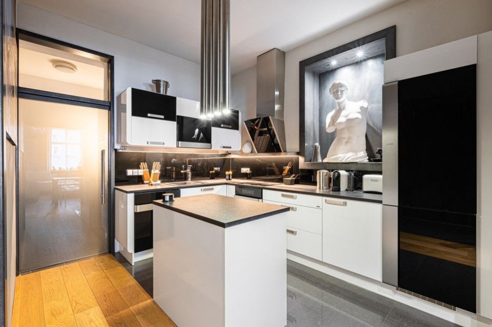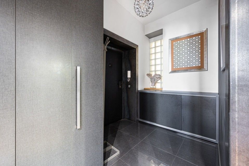 Kompletní vybavení zahrnuje: dřevěné podlahy a dlažba, podlahové vytápění v koupelně, bezpečnostní dveře, kompletně vybavená kuchyňská linka všemi spotřebiči, myčka, pračka, sušička, TV, domácí vrátný.
