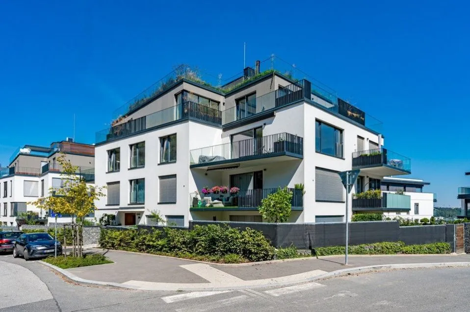 REZERVACE - Nízkoenergetický, vysoce nadstandardní byt 4+kk, o celkové ploše 153,2 m2, se dvěma terasami, umístěný ve 2. podlaží prémiové novostavby "top´rezidence Pomezí", postavené roku 2020, přímo vedle lesoparku Cibulka a Vidoule, na dosah centra města. Umístění na vrcholu kopce nabízí neopakovatelné výhledy na panorama Prahy.
