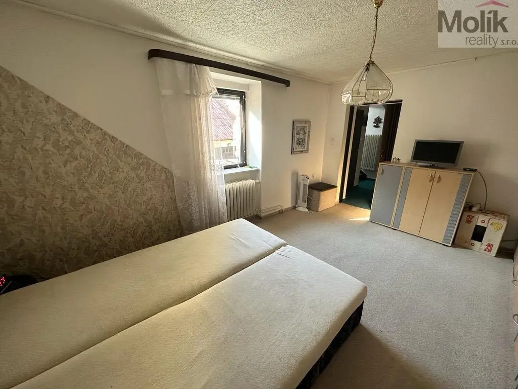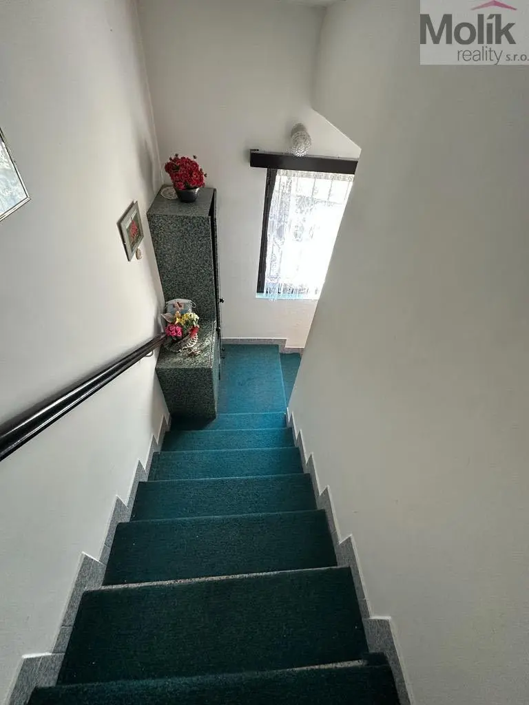 V horním patře se nachází bytová jednotka o dispozici 4+1 a v mezipatře další koupelna.