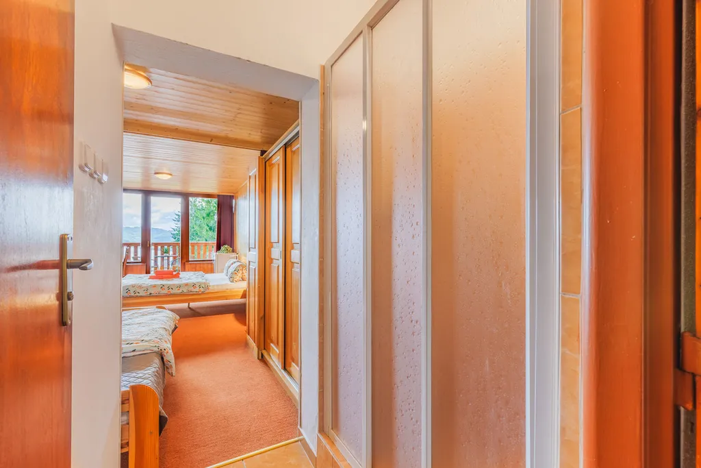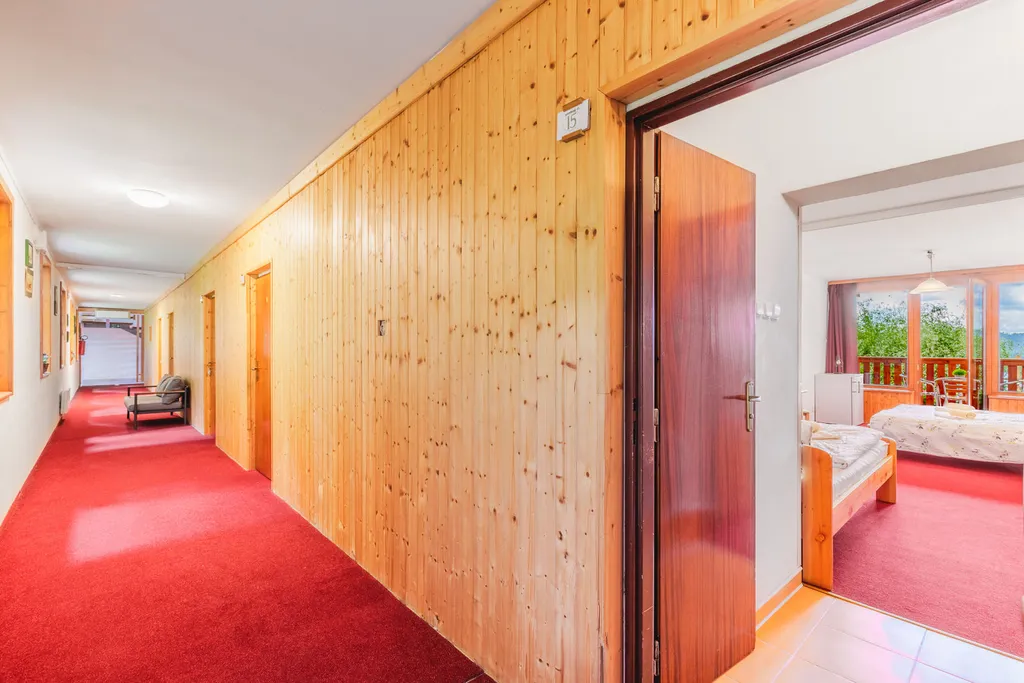 Stávající dispozice umožňuje ubytování až pro 64 hostů ve 15 stejných čtyřlůžkových pokojích, každý s vlastním sociálním zázemím a balkonem orientovaným do krajiny. Součástí areálu je také samostatný apartmán, který je nyní využíván pro personál, ale lze jej jednoduše upravit pro další hosty. Celková užitná plocha objektu přesahuje 1 200 m², parkovací plocha pojme přibližně 20 automobilů a celý areál působí čistě, udržovaně a připraveně k provozu.
