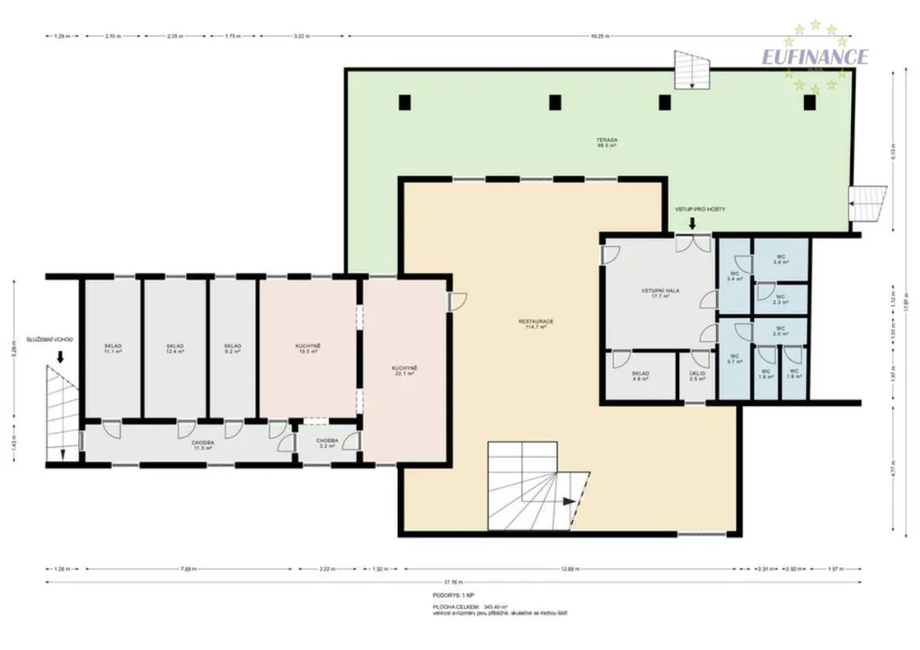 Celková plocha pozemku činí 1 336 m2, zastavěná plocha činí 414 m2 a užitná 485 m2. Součástí nemovitosti jsou okolní pozemky, které se částečně využívalo na parkovací stání nebo zahradu či venkovní posezení. Další zdarma parkovací stání pro restauraci se nachází u restaurace na obecním pozemku dostupné po obecní příjezdové komunikaci ul. Hostivítova.