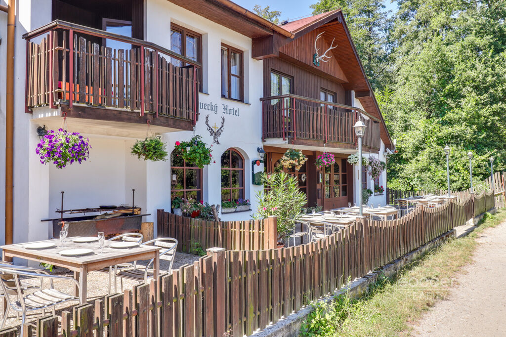 Nabídka zahrnuje možnost převzetí kompletního zařízení v dobovém loveckém stylu – masivní borovicový nábytek, lovecké trofeje, stylové lustry, bar, komody a kompletně vybavenou restauraci s kuchyní a letní terasou.