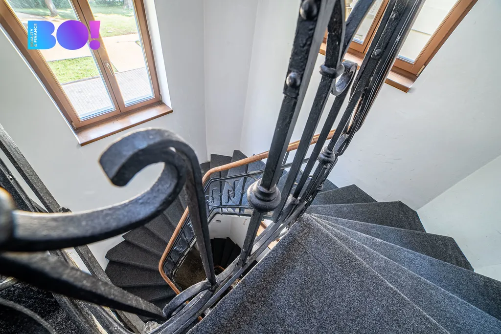 Hlavní schodiště vedoucí do 2. nadzemního podlaží je dalším architektonickým skvostem, který podtrhne ducha této nemovitosti.