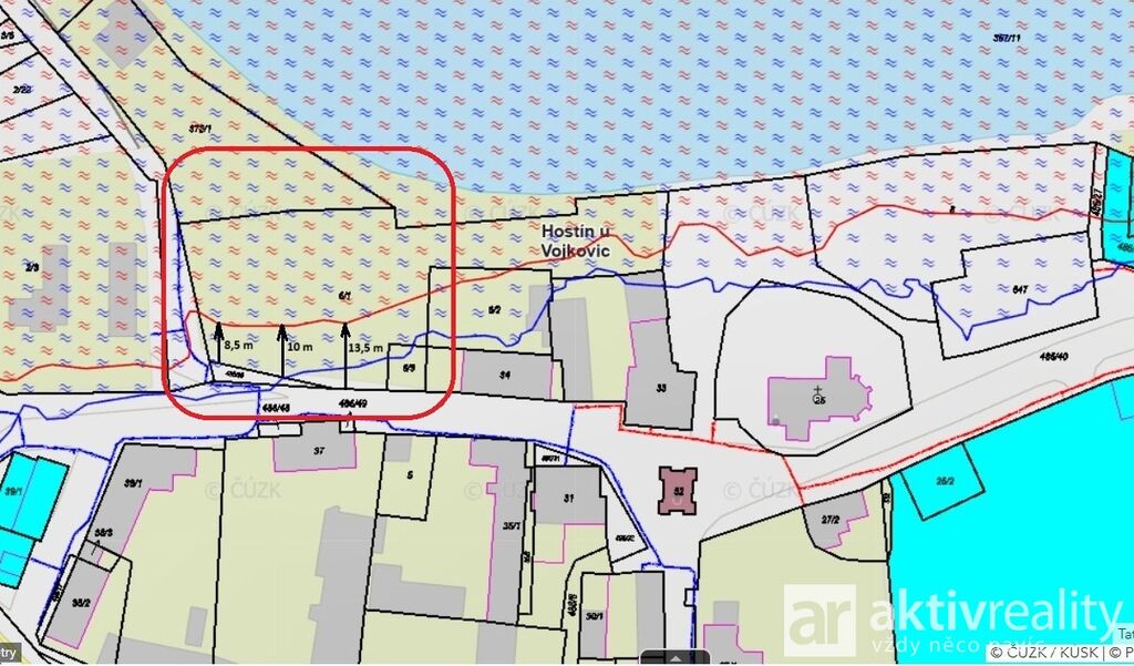 S umístěním stavby rodinného domu se počítá v horní části pozemku mimo aktivní zónu záplavy, mělo by být možné stavbu umístit na hranici pozemku přímo u komunikace. Při návrhu projektu je však nutné počítat s tím, že vodoprávní úřad a správce toku mohou stanovit dodatečné technické požadavky (např. na výškové osazení stavby, konstrukci základů, oplocení či další opatření), což může ovlivnit podobu budoucího domu a související náklady. Zájemcům doporučujeme konzultaci s příslušným stavebním a vodoprávním úřadem ještě před podáním žádosti o povolení stavby.