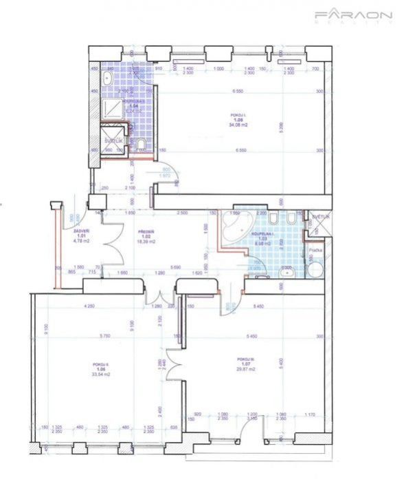 Dispozici plošně velkorysého bytu tvoří zádveří, vstupní hala, 3 pokoje, 2 koupelny (jedna s vanou, bidetem a WC; druhá se sprchovým koutem a WC).