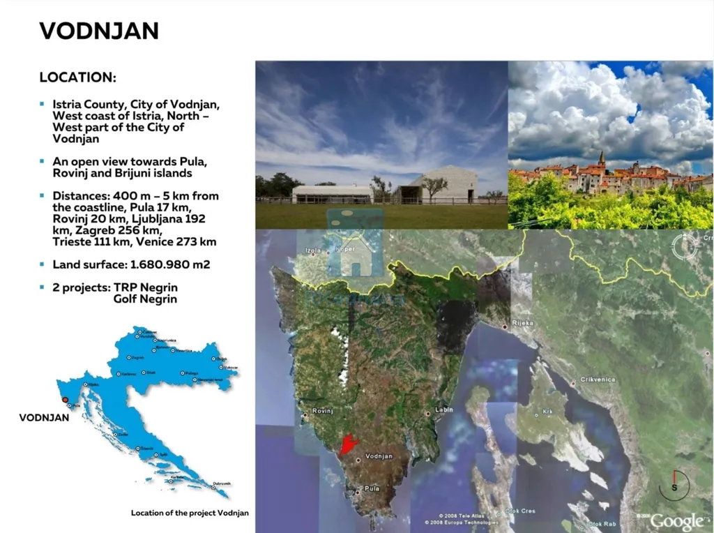 Vzdálenosti 400m-5km od pobřeží, Pula 17 km, Rovinj 20 km, Lublaň 192 km, Záhřeb 256 km, Terst 111 km, Benátky 273 km