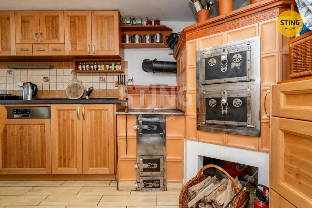 Kachlová kamna v kuchyni také slouží pro ohřev vody s rozvody do ústředního topení v celé chatě. V případě, že netopíte v kamnech, vodu lze ohřát také objemným el. bojlerem, který se nachází v koupelně.