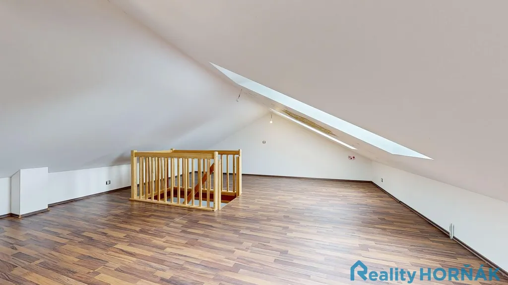 Z horní chodby je pak po dalším dřevěném schodišti přístupné obytné podkroví s prostornou místností ateliéru (pracovny, herny) s rozměry 6,82 x 4,50 = 30,7 m2, se dvěma střešními okny, směřujícími k fotbalovému hřiště za domem.