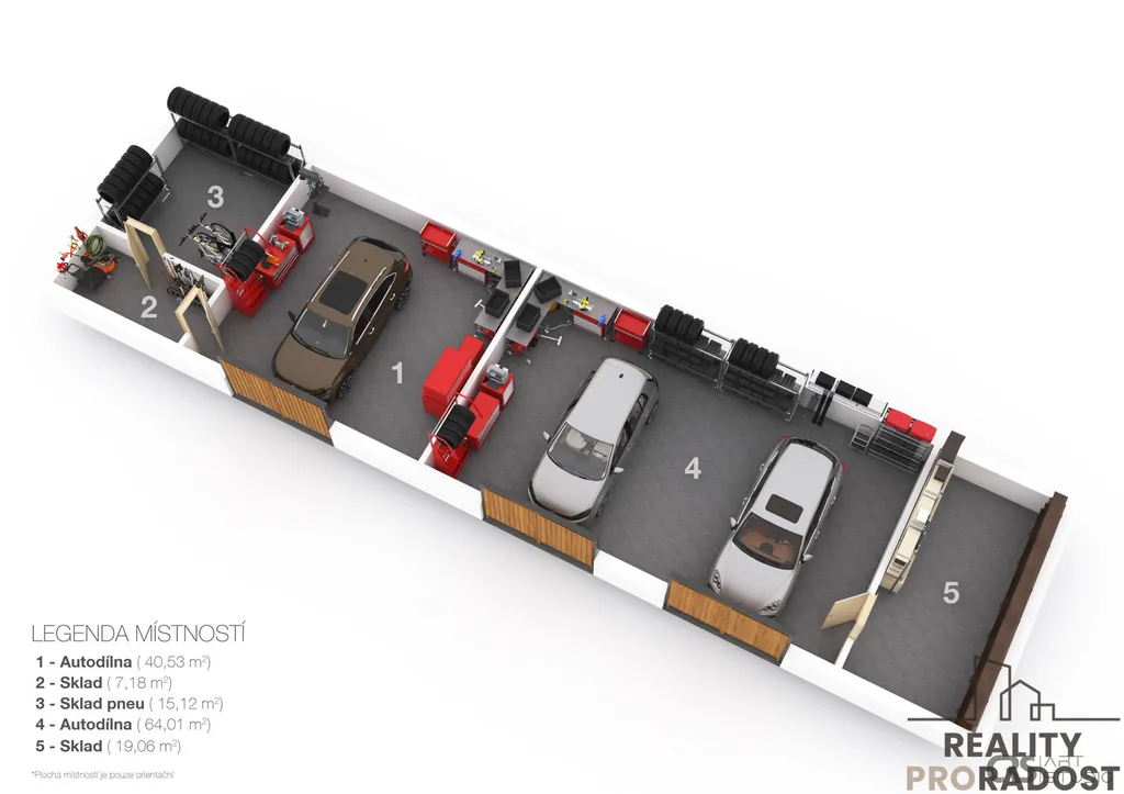 V této budově se nachází 3 garáže se samostatnými vjezdy, dále několik skladů a autodílna. Výměra činí 146 m2.