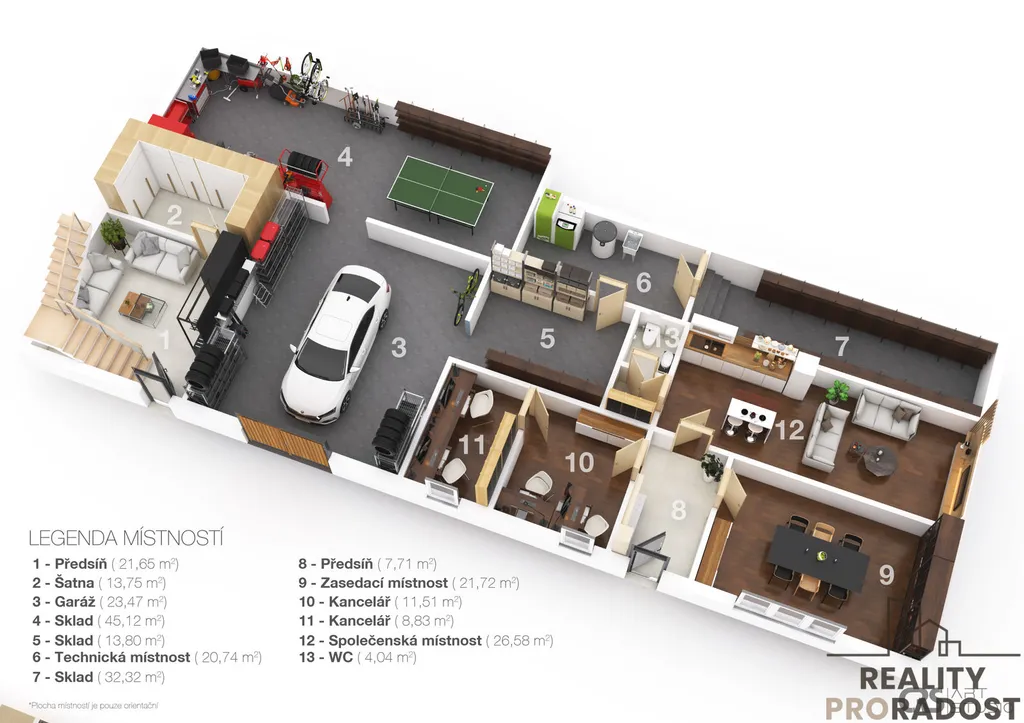 Tato budova je velice specifická a má multifunkční využití. Skládá se ze 2 bývalých stodol, které prošly rekonstrukcí. V 1.NP této budovy se nachází několik skladů a kanceláří. Další výhodou je garáž. Ve 2.NP se nachází prostorný a vkusně zrekonstruovaný byt o dispozici 5kk s menší terasou a výhledem do zeleně. Celková užitná plocha 1.NP je 251 m2 a bytu ve 2.NP je 244 m2.