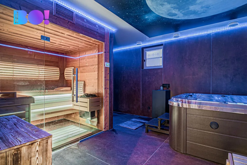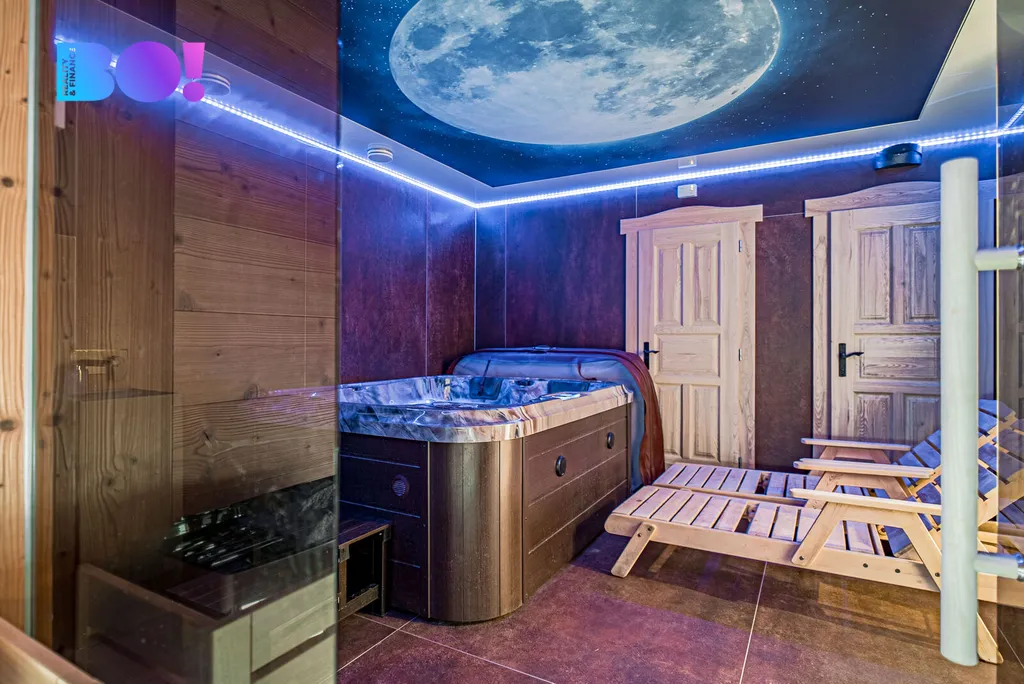 Přízemí domu je skutečnou perlou. Kompletní wellness, včetně vířivky BALBOA, sauny, odpočinkové části a sprchy vše doplněné o atmosféru hvězdného nebe. Vinný sklípek je ideální pro uskladnění oblíbených vín a posezení při degustaci.