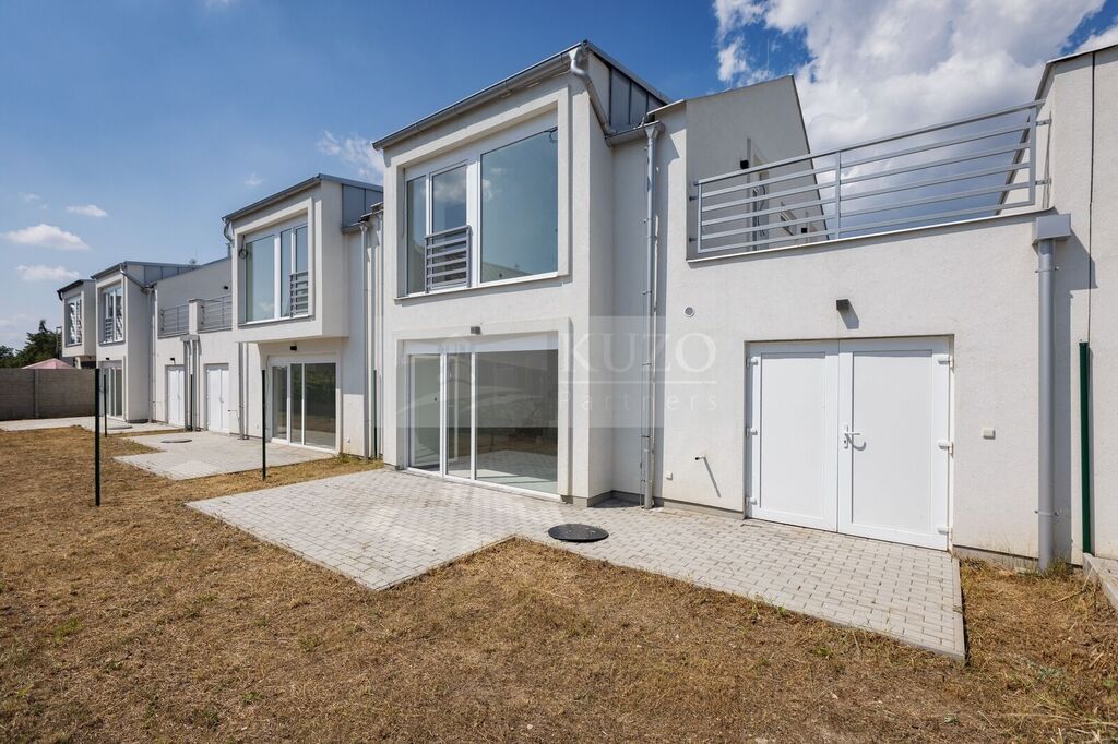 Za domem je navíc vstupem z obývacího pokoje k dispozici venkovní terasa. Celková výměra pozemku, který náleží k domu je 202 m². Z toho je zastavěná plocha 103 m².