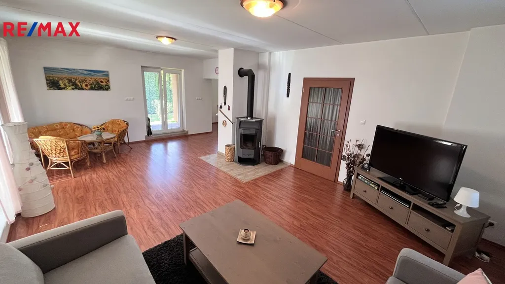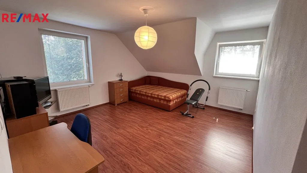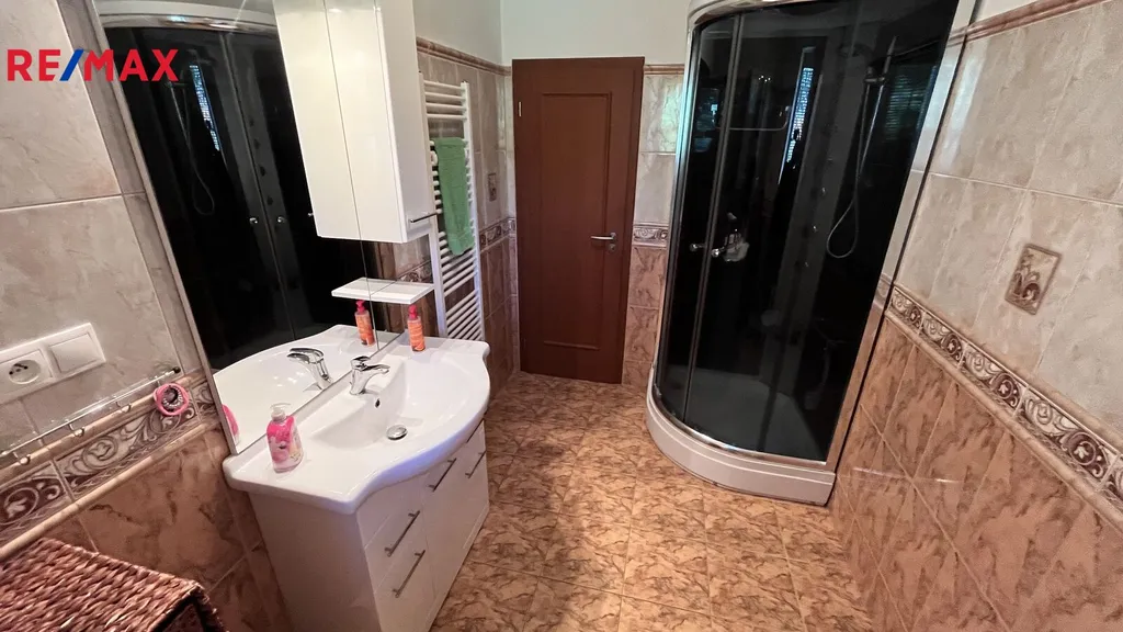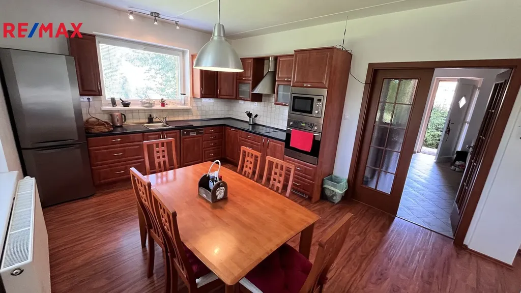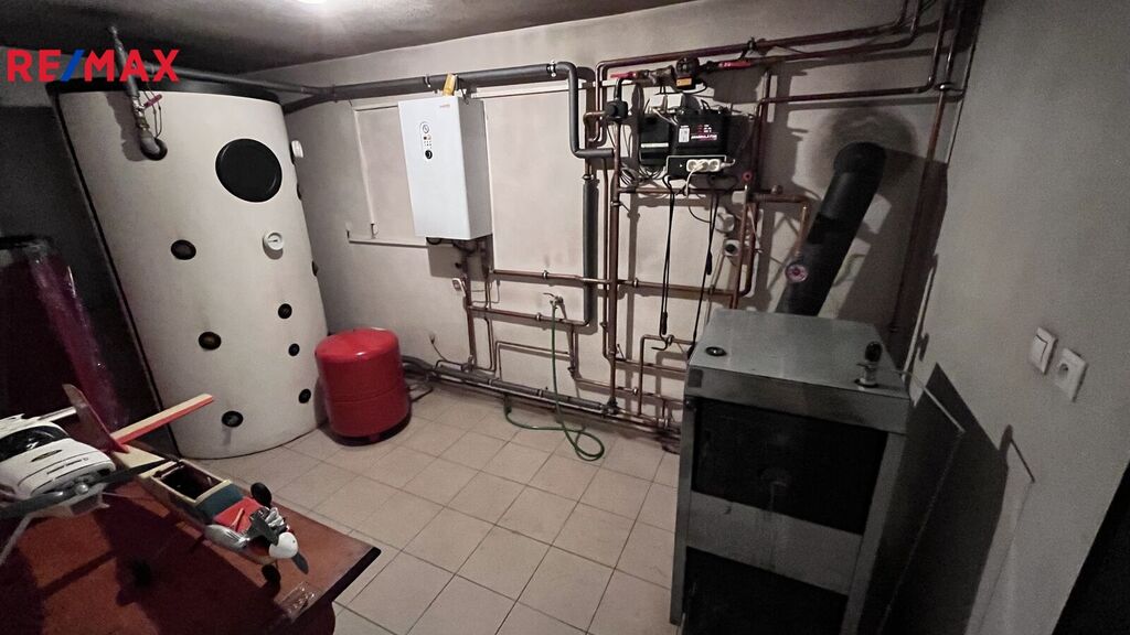 Jedná se o prodej samostatně stojícího rodinného domu v okrajové části obce Bácovice o zast. ploše 102m2 a zahrady 1.608m2 s celkovou plochou pozemku 1.710m2. dům je celý podsklepen, nachází se zde garáž 25m2, kotelna 21m2 a zbylé sklepní plochy s propojovacím schodiště do 1. NP kde je vstupní předsíň 12,54m2, koupelna se sprchovým koutem a WC 5,69m2, obývací pokoj 35m2 a kuchyně 15,93m2. Ve 2.NP se nachází tři pokoje 21,51m2, 14m2 a 13m2, dále koupelna s vanou 10,41m2, chodba 7,02m2, samostatné WC 2m2 a pracovna 5,19m2. Půdní prostor je skladový. Dům je napojen na obecní vodovod, odkanalizování je svedeno do jímky, zdivo domu je cihelné se zateplením, okna domu jsou plastová. Vytápění je ústřední kotlem na tuhá paliva popř. elektrokotlem, v obývacím pokoji se dále nachází krbová kamna. Střešní krytinu tvoří taška pálená. Před domem jsou zpevněná parkovací místa, celý pozemek je oplocen, je možné rozdělení na další stavební parcelu. Zahrada v okolí domu je upravená s pergolou a posezením. Obec Bácovice se nachází 7 km od Pelhřimova, kde se nachází veškerá vybavenost. Pro více informací voleje makléře nabídky.