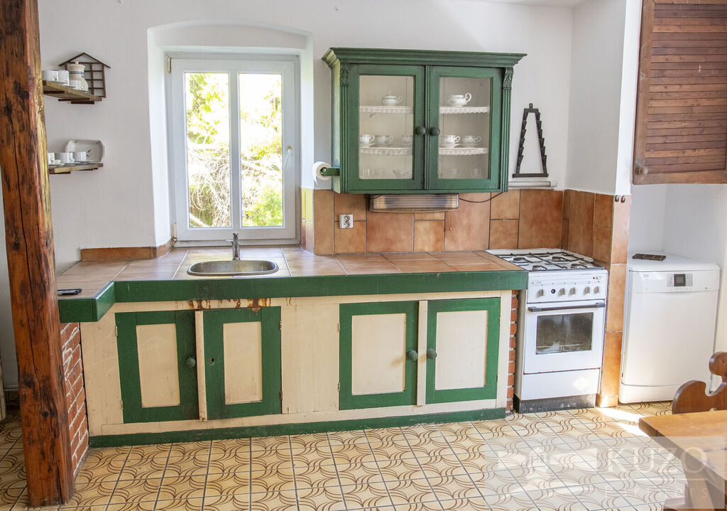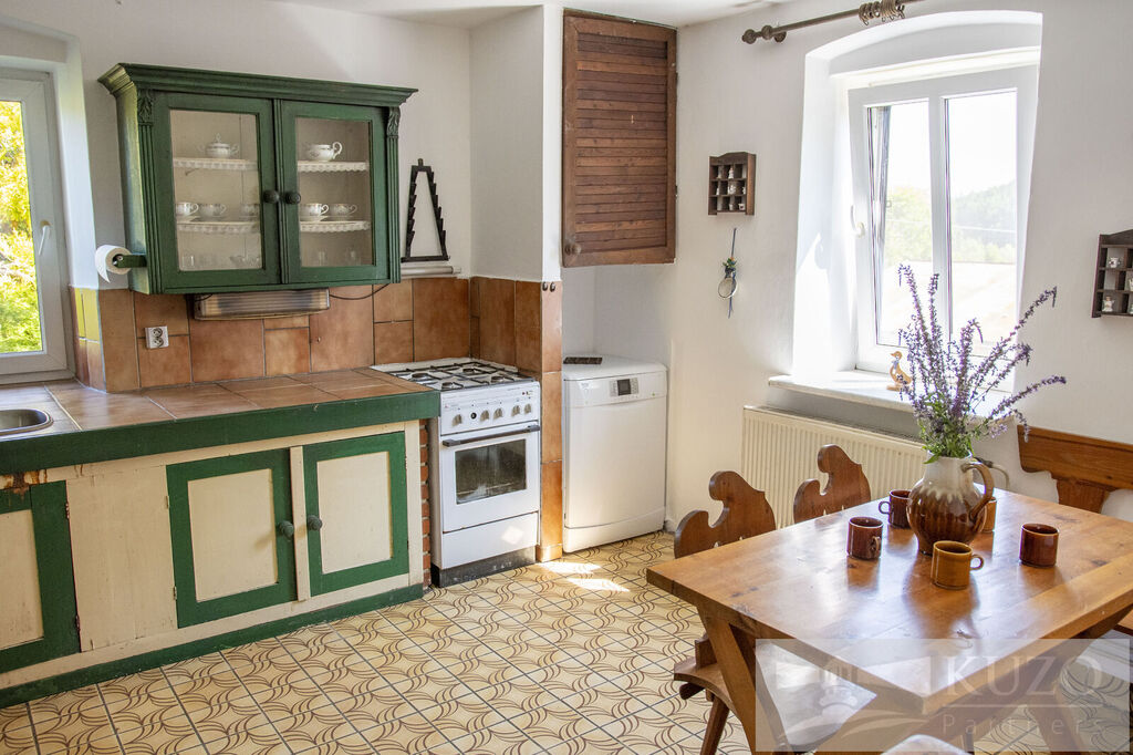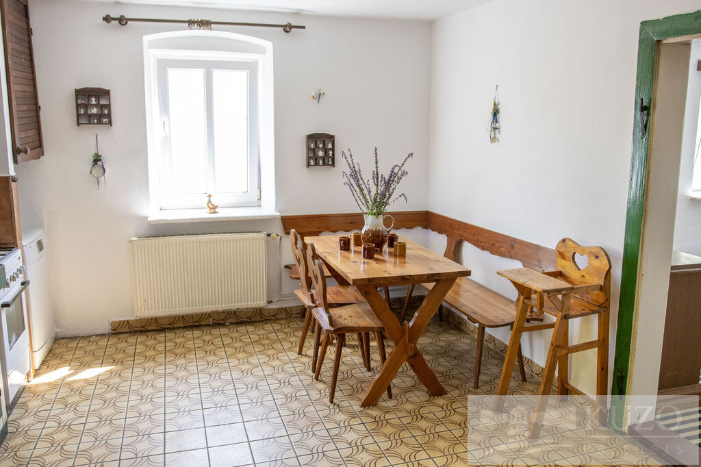 Interiér domu nabízí velkou kuchyni, kde se pohodlně uvaří pro celou rodinu, a v obývacím pokoji můžete ocenit kachlová kamna, která vytvářejí útulnou atmosféru. Celkem se zde nachází 5 ložnic, což poskytuje dostatek prostoru pro celou rodinu. Dům obsahuje 2 samostatné toalety a 1 koupelnu, což usnadňuje každodenní rutinu s dětmi.