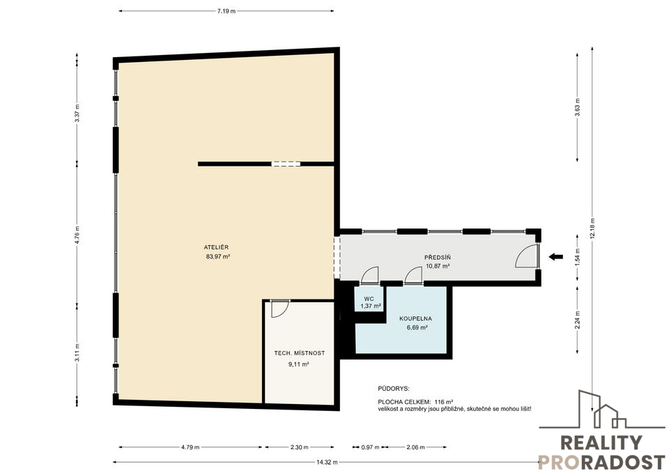 Při koupi této jednotky hradíte pouze první splátku za družstevní podíl - 3.657.500,- Kč. Zbylá anuita (75 % ve výši 9.742.500,- Kč je splácena družstvu měsíční splátkou ve výši 46.978,- Kč, splátky jsou vypočítány na 40 let s 5% úrokem, tuto dobu lze zkrátit). Ateliér lze pronajmout, tržní nájemné činí cca 25.000,- Kč za měsíc. V případě koupě družstevního podílu není nutné projít skóringem jako u banky. Celková cena nemovitosti činí 13.400.000,- Kč.
