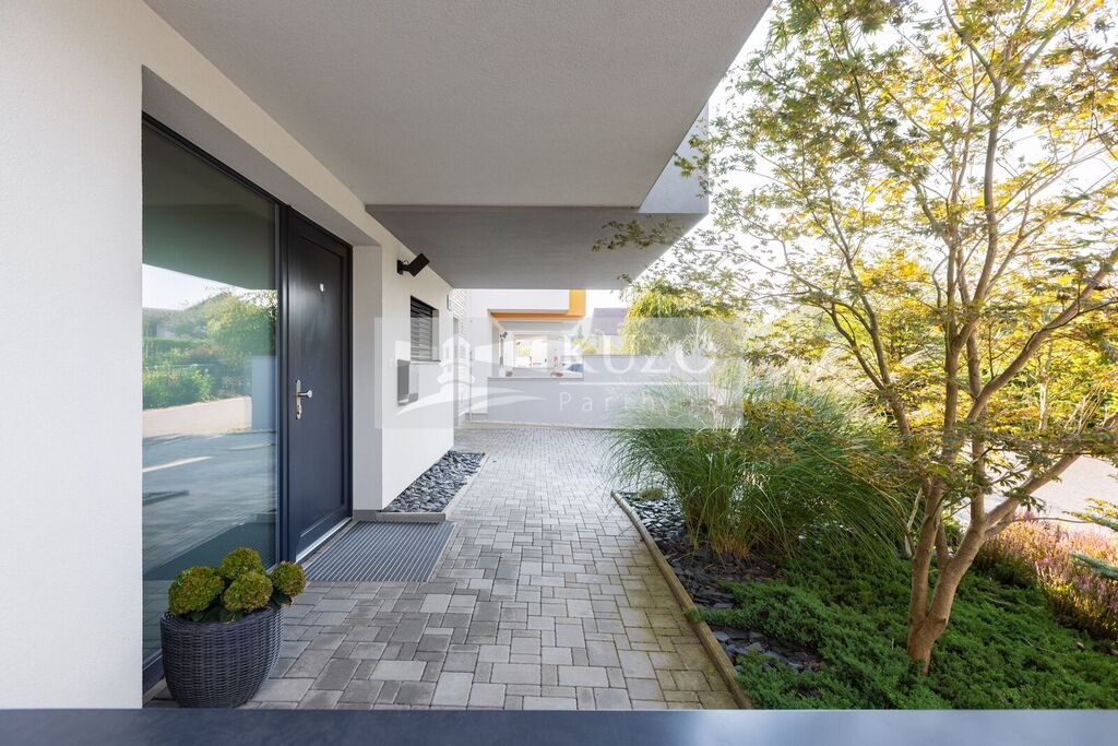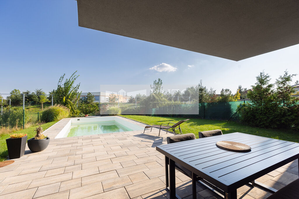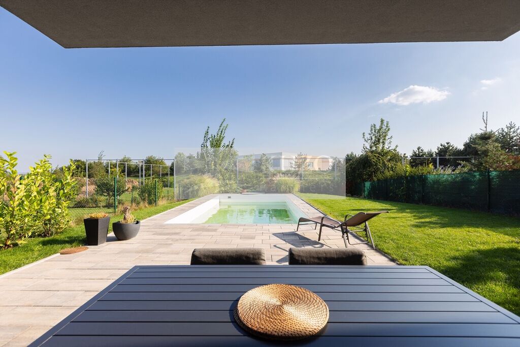 Zahrada a bazén - Vaše soukromá oáza: Soukromá zahrada je vaší oázou klidu, kde si můžete vychutnat sluneční paprsky, pěstovat vlastní bylinky nebo si jen tak odpočinout s knížkou v ruce. A co teprve osvěžující koupel ve vlastním bazénu (40 m2) během horkých letních dnů. Také Garáž propojená se zahradou zvyšuje komfort bydlení a navíc poskytuje bezpečné parkování pro vaše vozidlo.