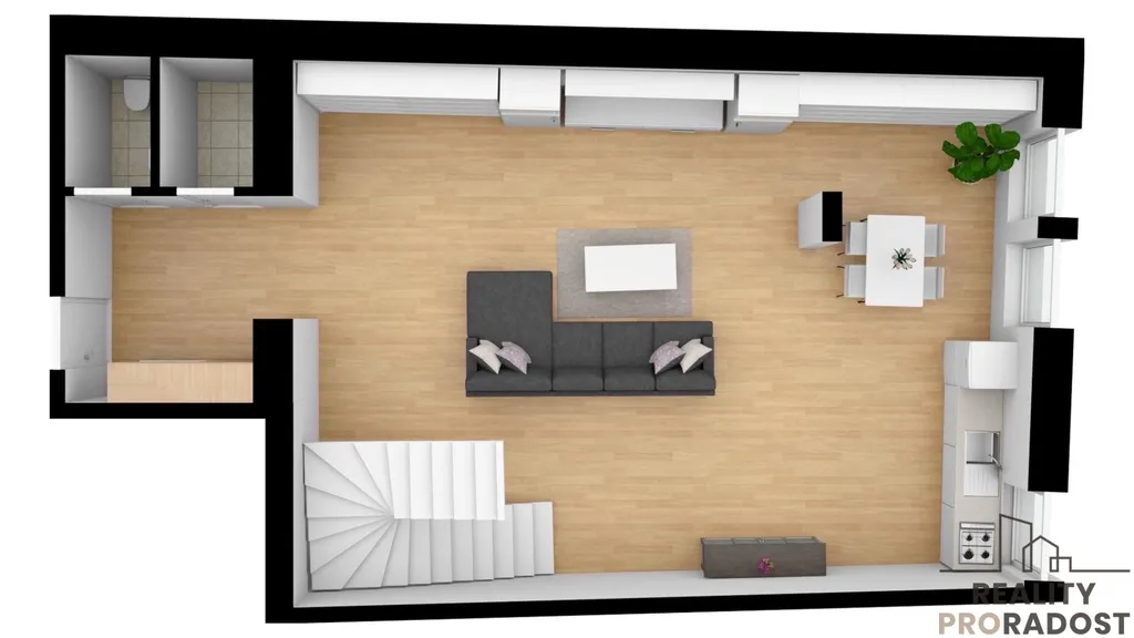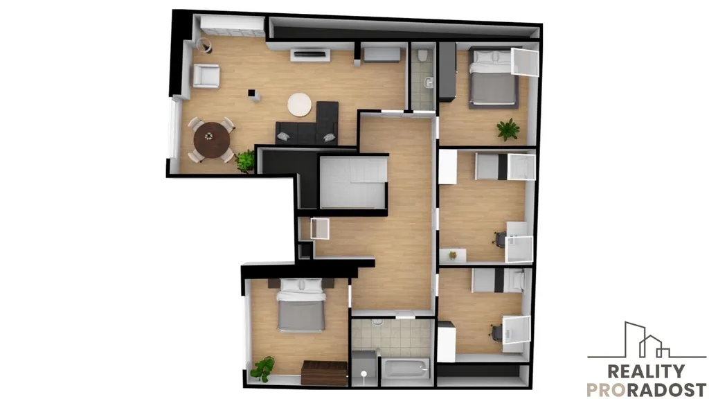Již při vstupu do bytu zaujme podlahové vytápění a klimatizace, které zajišťují dokonalý komfort a pohodlí. Elegantní kuchyň s moderními spotřebiči a luxusními detaily je snem každého gurmána. Největší bytová jednotka v komplexu. Ve spodní části mezonetu se nachází obývací pokoj, kuchyňský kout s jídelnou, WC a technická místnost. V horním patře najdete 5 samostatných pokojů, WC a koupelnu s vanou a sprchovým koutem.