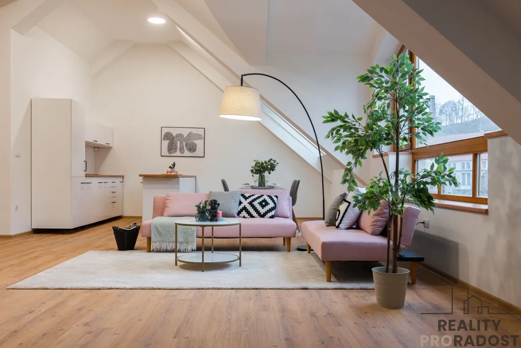 Již při vstupu do ateliéru zaujme podlahové vytápění a klimatizace, které zajišťují dokonalý komfort a pohodlí. Ateliér, dispozice 4+KK o velikosti 135,70 m2. 3 neprůchozí pokoje, kuchyně s obávacím pokojem o velikosti 36 m2. Koupelna s vanou a sprchovým koutem, samostatné WC, druhá koupelna. Jediný byt na patře, samostatný vstup. Výhled na Hrádek.