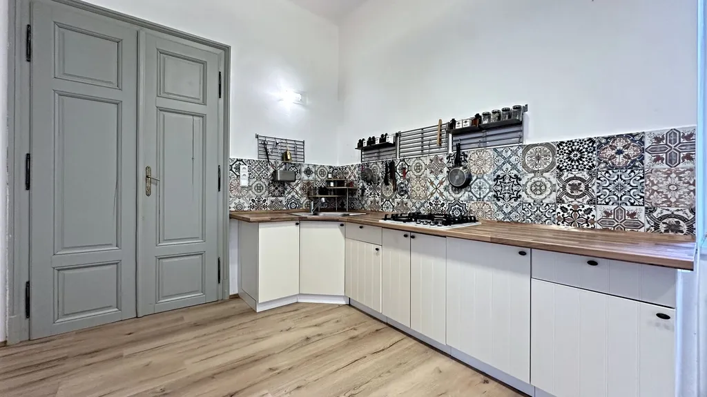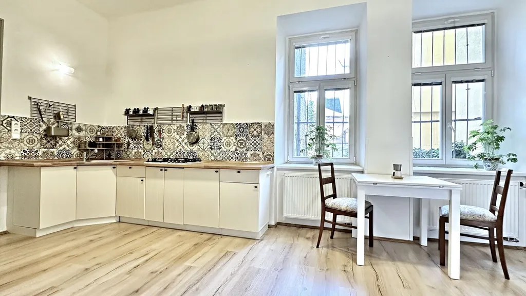 Byt se nachází ve zvýšeném přízemí cihlového historického bytového domu. Čistá podlahová plocha bytu je 103 m2 a celkovou užitnou plochu 114m2, součástí prodeje je i zděný sklep s výměrou 13m2.