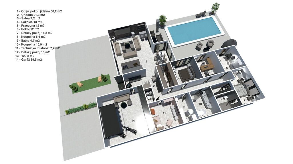 Bungalov o velikosti 6+kk a garáží pro dva automobily a zázemím pro všechny náročné nadšence, kteří chtějí mít v domě svůj vlastní pánský prostor, 11ti metrovým krytým vyhřívaným bazénem, v něm vsazeném sezení, vířivkou pro šest osob a všemi nejmodernějšími technologiemi, které současný trh nabízí, má žitnou plochu 241,3 m² a celkovou zastavěnou plochu krásných 288 m². Dům leží na pozemku o výměře 892 m².