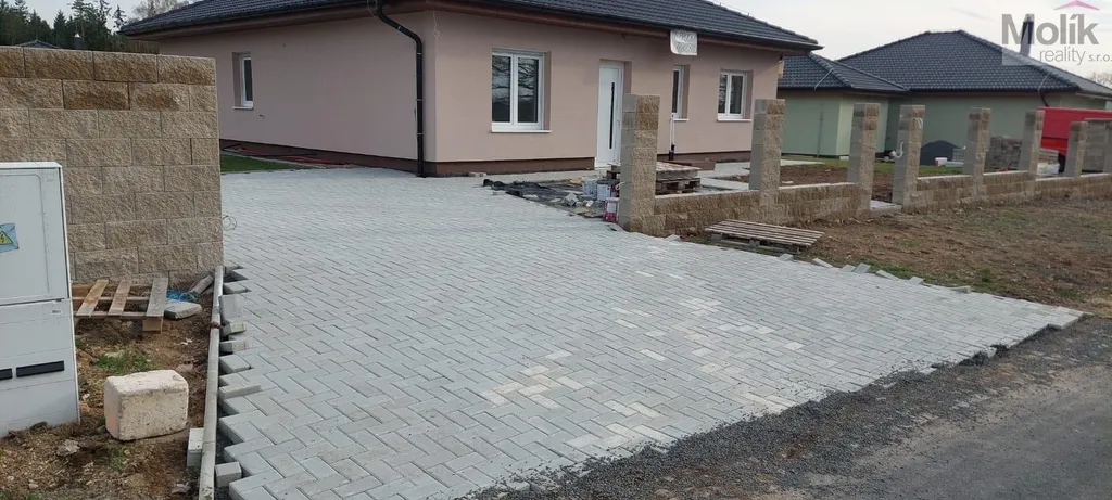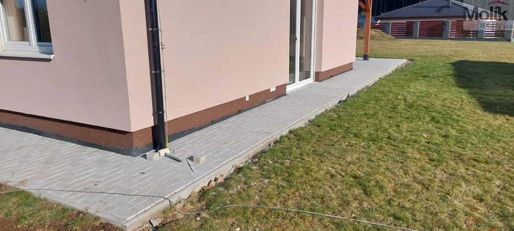 Na pozemku dokončeny terénní úpravy (3 m3 nádrž na dešťovou vodu, připraveno na zavlažování, vysázená tráva, vybetonované základy na plot, přivedená elektřina na pojezdovou bránu + videozvonek).