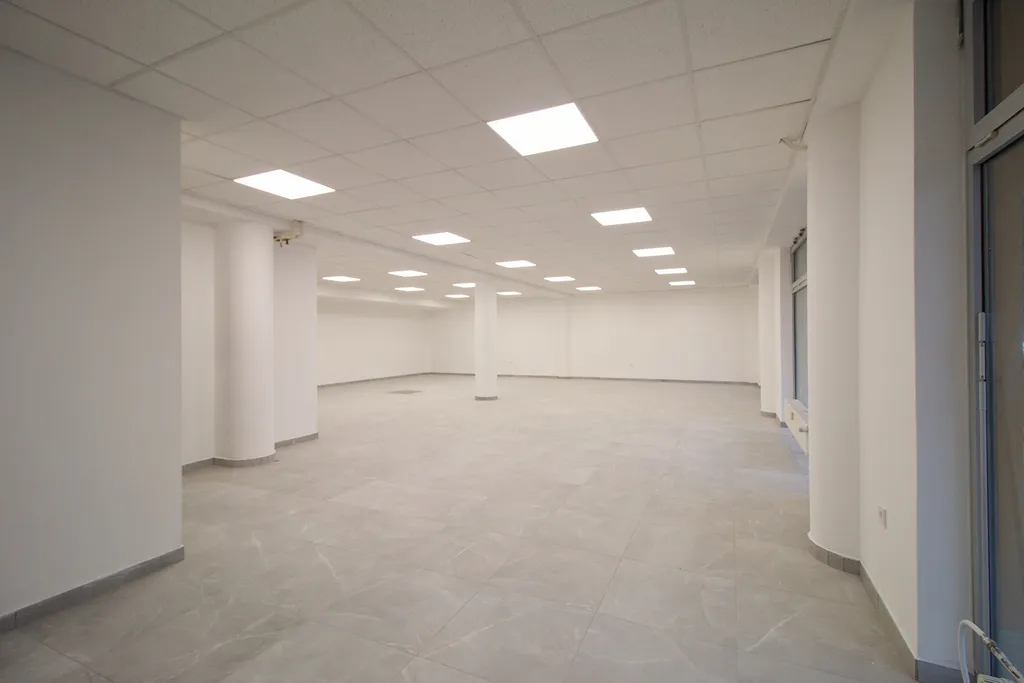 Komerční prostor je zrekonstruován. Na podlaze je položena velkoformátová dlažba a na stropě jsou snížené podhledy se světly. K dispozici jsou 2 WC a kancelář.