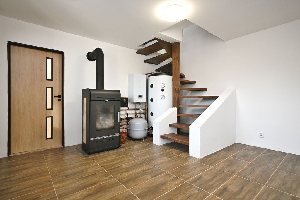 Topení je řešeno krbovými kamny na dřevo a dřevěné brikety s teplovodním výměníkem 8kwh do vody a 5kwh. Sekundární možnost vytápění zajišťuje elektrokotel o výkonu 13kwh. Akumulační nádrž o velikosti 1000L poskytuje při plném natopení teplo na vytápění po dobu 20 hodin.