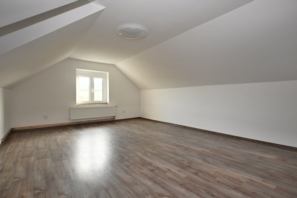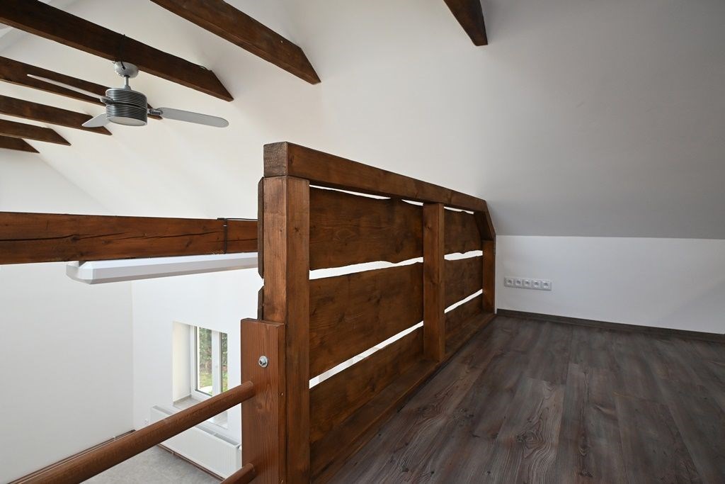 Je zde předsíň, hala, koupelna s vanou a WC a pokoj, ze kterého se lze dostat do kuchyně či po schodišti do podkroví. Zde je pracovna a ložnice.