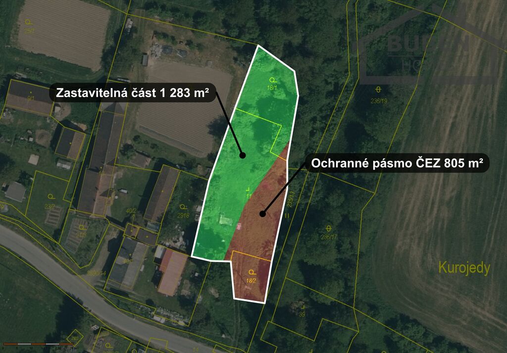 Dovoluji si Vám nabídnout k prodeji pozemek určený pro výstavbu rodinného domu v obci Kurojedy u Boru. Celková výměrová plocha pozemku činí 2088 m2. Z této výměry lze 1300 m2 využít dle územního plánu ke stavebním účelům pro plochy smíšené, obytné - venkovské bydlení. Maximální podlažnost 2 nadzemní podlaží s obytným podkrovím (šíře určená pro výstavbu cca 20 m délka cca 60m2). Inženýrské sítě se nachází v blízkosti hranice pozemku (vodovod, elektřina nadzemní - podél pozemku), veškerá vyjádření ohledně přípojek jsou k dispozici. Kanalizace v této části obce není, nutné řešit ČOV. Obec Kurojedy leží 3 km od průmyslová zóny Nová Hospoda a dálničního přivaděče (exit Bor) a 10 km od města Bor, kde se nachází veškerá občanská vybavenost. Z obce je zajištěna pravidelná autobusová doprava.