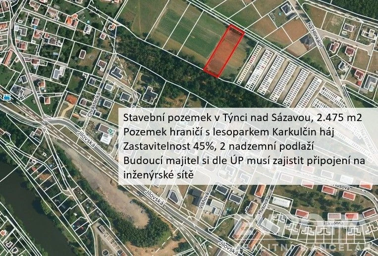Exkluzivně nabízíme stavební pozemek určený pro bydlení o rozloze 2475 m². Pozemek se nachází v severozápadní části Týnce Sázavou a hraničí s místním lesoparkem. Pozemek je rovinatý, což usnadňuje případnou výstavbu a snížení nákladů na zemní práce. Dle územního plánu se jedná o stavební pozemek pro bydlení venkovského typu, zastavitelnost 45%, výška max.2 nadzemní podlaží. Územní plán počítá s rozvojem celé této lokality, a to včetně připojení na inženýrské sítě. Přístup na pozemek je po soukromé komunikaci, která je územním plánem definována jako tzv. dopravní infrastruktura jistota příjezdové cesty. Pozemek je prodáván od místního majitele. Mezi pozemkem a centrem města Týnec je krásný lesopark Karkulčin háj. Pokud hledáte místo s dostatkem prostoru, krásnou přírodou a v bezprostřední blízkosti centra malebného městečka, jste správně.