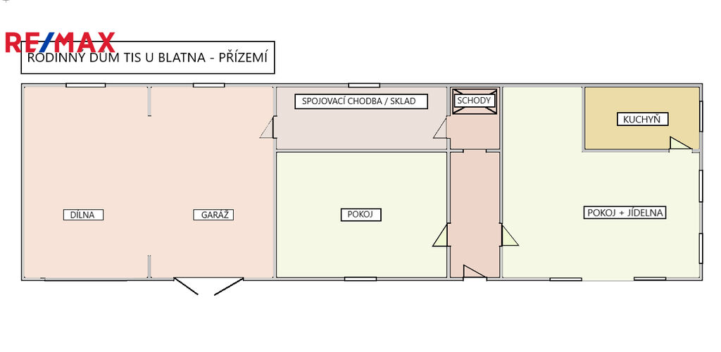 V přízemí je kuchyň, dva pokoje, vstupní chodba. V patře pak pokoj, půda, vstup na terasu.