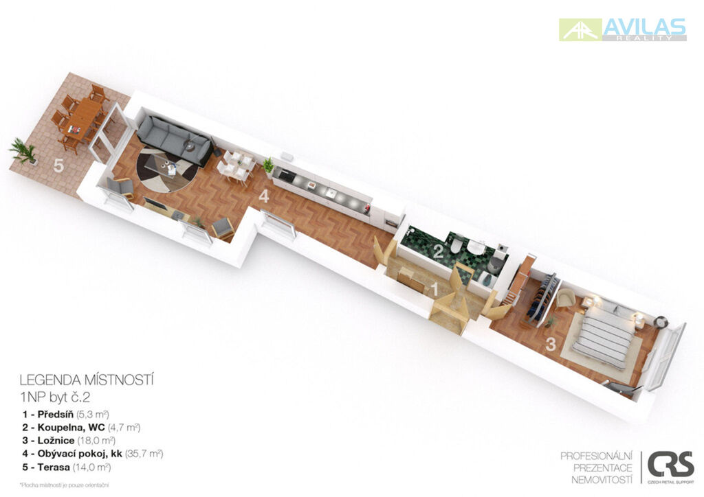 Dispozice bytu: obývací pokoj s kuchyňským koutem 35,7 m2, ložnice 18 m2, koupelna se sprchovým koutem a toaletou 4,7 m2, zádveří 5,3 m2, terasa 14 m2. K bytu dále náleží sklep a zahrada navazující na terasu.