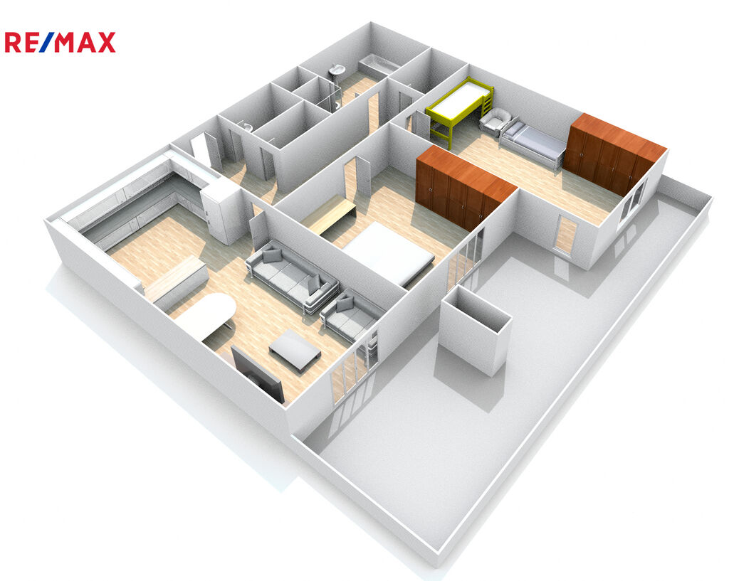 Byt je promyšleně navržen tak, aby poskytoval maximální pohodlí a dostatek soukromí. Dominantou je prostorný obývací pokoj spojený s kuchyňským koutem, který tvoří hlavní společenskou část bytu. Velká okna propouštějí přirozené světlo a zároveň umožňují přímý vstup na terasu, která je skutečným klenotem této nemovitosti. Otevřený prostor propojuje interiér s exteriérem, což přináší pocit vzdušnosti a volnosti.