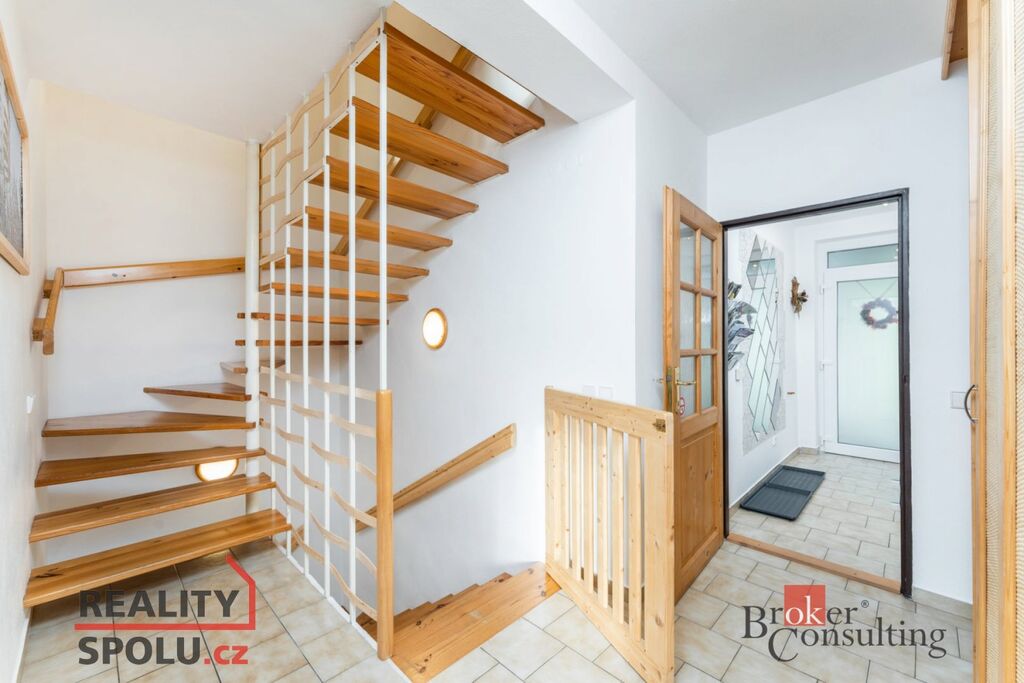 Vstup z ulice, kde je i garáž a kryté parkovací stání, je do II. NP, kde se nachází předsíň, samostatné WC s umyvadlem, kuchyň, komora, obývací pokoj se vstupem na balkón a ložnice. Z předsíně je vstup do obytné části nebo na centrální schodiště, kudy můžete jít dále do I. NP nebo do obytného podkroví. V obytném podkroví se nachází 3 pokoje a koupelna s WC.