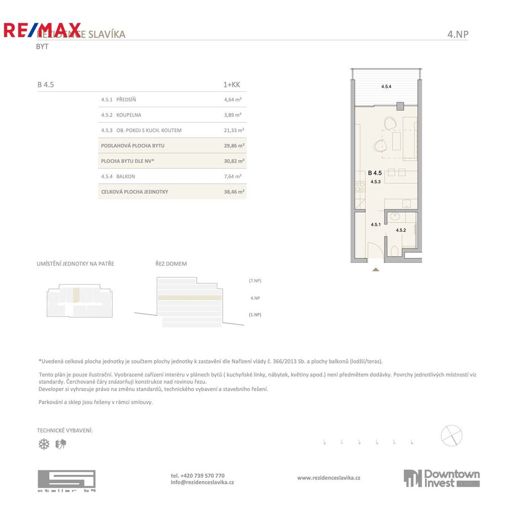 Byt se skládá z předsíně s možností vestavěné skříně , koupelny se sprchovým koutem a toaletou , obývacího pokoje s kuchyňským koutem a terasou s nádherným výhledem do klidného vnitrobloku.
