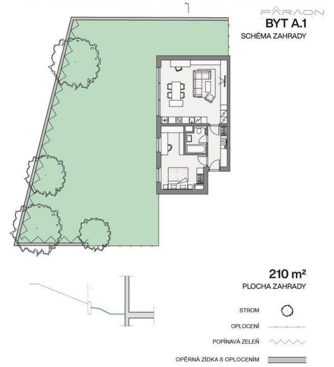 Byt v kvalitním provedení s vlastní zahradou, s důrazem na vzdušnost a světlo, ale i využití moderních technologií (fotovoltaika pro spotřebu ve společných prostorách).