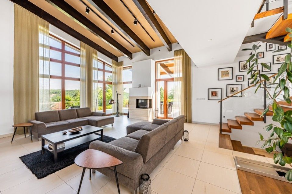 Nadčasová, nízkoenergetická (B), velkoryse pojatá, třípodlažní vila (z roku 2012) s bazénem, prosvětleným a vzdušným interiérem na slunném upraveném pozemku (2276m2). Dům je součástí uzavřeného, rezidenčního komplexu luxusních vil v mimořádně klidné lokalitě Velká Chuchle v krásné komorní čtvrti Prahy 5 se vzrostlou zelení zasazené do klidného, jedinečného místa obklopeného vzrostlou zelení, v blízkosti Radotínsko-Chuchelského háje a přírodní rezervace Homolka nabízí ničím nerušené výhledy do zahrady, přilehlé zeleně a panorama Prahy. Luxusně vybavená vila je vhodná i pro vícegenerační bydlení nebo pro velkou rodinu s chůvou.