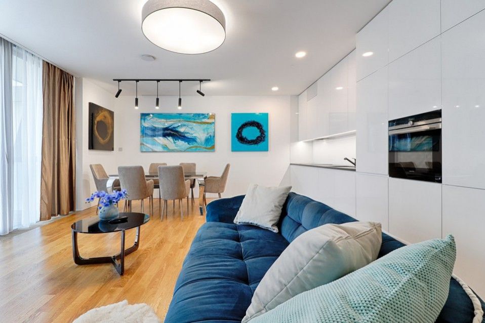 Nadstandartní a zcela kompletní vybavení zahrnuje luxusní kuchyňskou linku Hanák v bílém lesklém designu se všemi spotřebiči SIEMENS, myčka Miele, vestavěné šatní skříně na míru. Luxusní dřevěné dubové podlahy v obývacím pokoji s kuchyní, v ložnicích koberce, v koupelnách carrarský mramor a zařizovací předměty Villeroy and Boch. Osvětlení v celém bytě a exteriérové žaluzie na dálkové ovládání. Sušička, pračka.