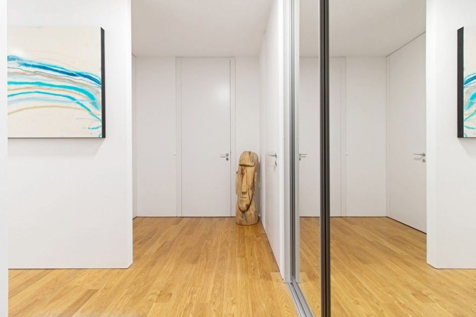 Dispozice bytu 3kk zahrnuje vstupní halu, otevřený prostor obývacího pokoje s kuchyní v bílém designu a jídelnou a přímým výstupem na terasu, dvě oddělené ložnice také s výstupy na terasou, dvě koupelny, první prostorná koupelna (vana, sprchový kout, toaleta, bidet), druhá koupelna se sprchovým koutem a toaletou, další samostatná toalety, dostatečné množství úložných prostor, úklidová místnost pro na míru zhotovená šatna. Celý byt lemuje ochozí terasa, která je přístupná ze všech pokojů.