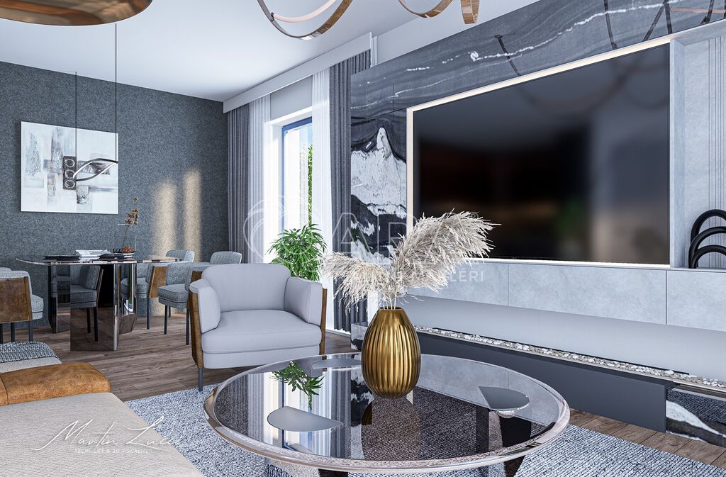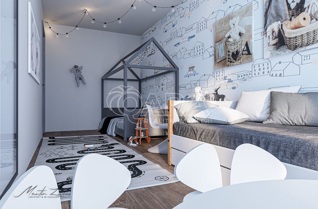 Čeká na vás elegantní design tří koupelen, dveří a podlah, trendové materiály, podlahové vytápění, venkovní automatické rolety a určitě oceníte také šestikomorové provedení oken a dveří se zasklením tepelně izolačními trojskly včetně oblíbených velkých HS portálů.