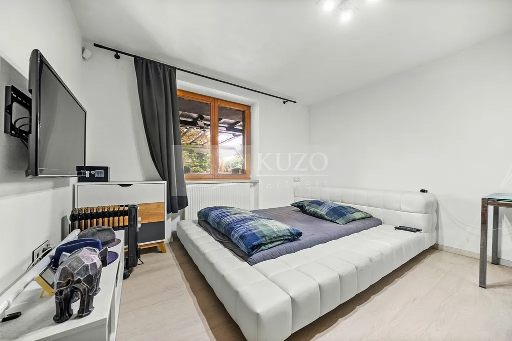 V přízemí se nachází pracovna se sociálním zařízením a bytová jednotka 1+1 rovněž se sociálním zařízením. Je zde také vstup do prádelny, kotelny, botárny a dvougaráže. V 1. patře je nově zrekonstruovaná kuchyně s moderními spotřebiči (horkovzdušná trouba, mikrovlnná trouba, nadstandardně velká indučkní varná deska 52 x 78 cm, myčka nádobí, americká lednice), útulná jídelna, velká koupelna, prostorný obývací pokoj a pohodlná ložnice s balkónem a výhledem na zahradu, menší pokoj, sociální zařízení a spíž.
