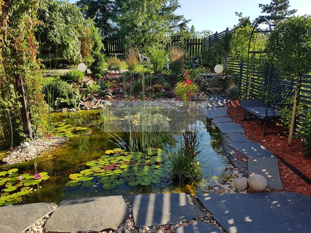 Zahrada tohoto domu je skutečnou oázou klidu. Najdete zde nejen pergolu z dubového dřeva, ale také dvě relaxační zóny. Dále je zde okrasné jezírko s rybkami, které dotváří atmosféru klidu, a vířivka pro relaxaci. Celý prostor zahrady (realizované v souladu s Feng Shui) je ideální pro rodinné oslavy, grilování s přáteli nebo jednoduše pro chvíle odpočinku. Celý pozemek je oplocen a osázen živým plotem ze stálezelených bobkovišní.