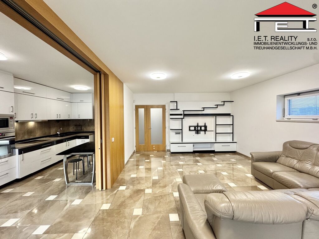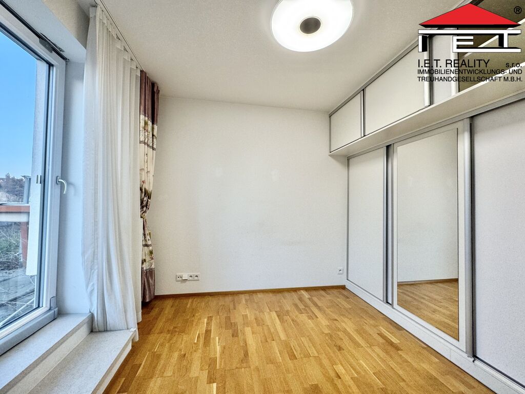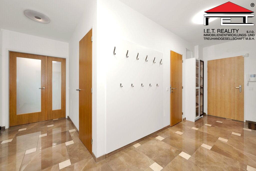 Prostorná předsíň s šatnou a samostatným WC tvoří vstupní část bytu. Na ni navazuje první koupelna a dva neprůchozí pokoje, z nichž jeden má vlastní balkón. Hlavní obytný prostor tvoří velký obývací pokoj s dalším balkónem. Vedle obývacího pokoje se nachází kuchyně s praktickým uspořádáním, nabízející dostatek prostoru pro příjemnou přípravu jídel. Centrální ložnice je dalším nadstandardním prvkem bytu – poskytuje soukromí a komfort díky vlastní koupelně, šatně, balkónu a přístupu na vlastní střešní terasu, kde si můžete užít svoji relaxaci obklopeni zelení. Šatna u ložnice disponuje oknem, takže nabízí možnost alternativního využití jakožto pracovny či dalšího obytného pokoje, k čemuž je aktuálně také využívána. Parkovací stání se nachází v suterénu nemovitosti a je přístupné i bezbariérově výtahem. K bytu náleží také sklepní kóje.