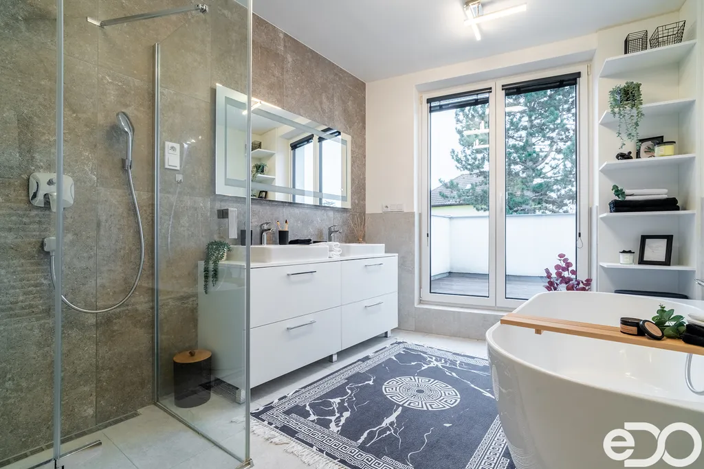 Moderní kuchyňská linka na míru je vybavena všemi vestavěnými spotřebiči – včetně kávovaru, takže si ranní kávu můžete vychutnat rovnou u jídelního stolu.