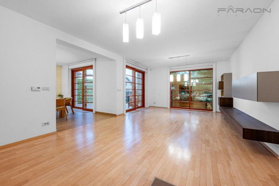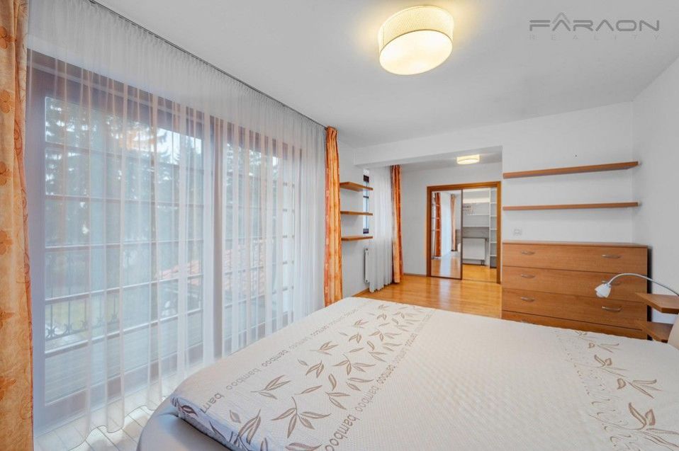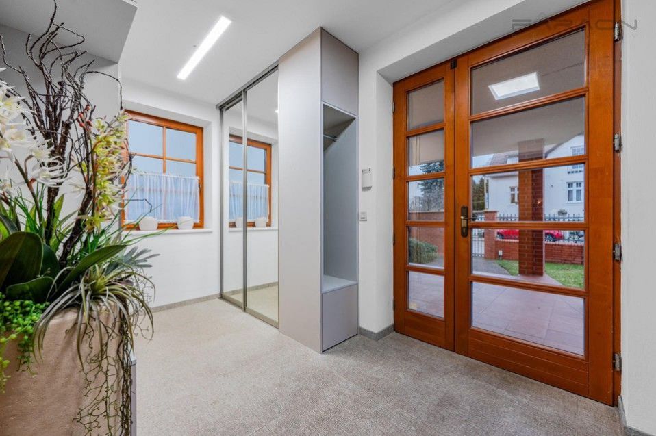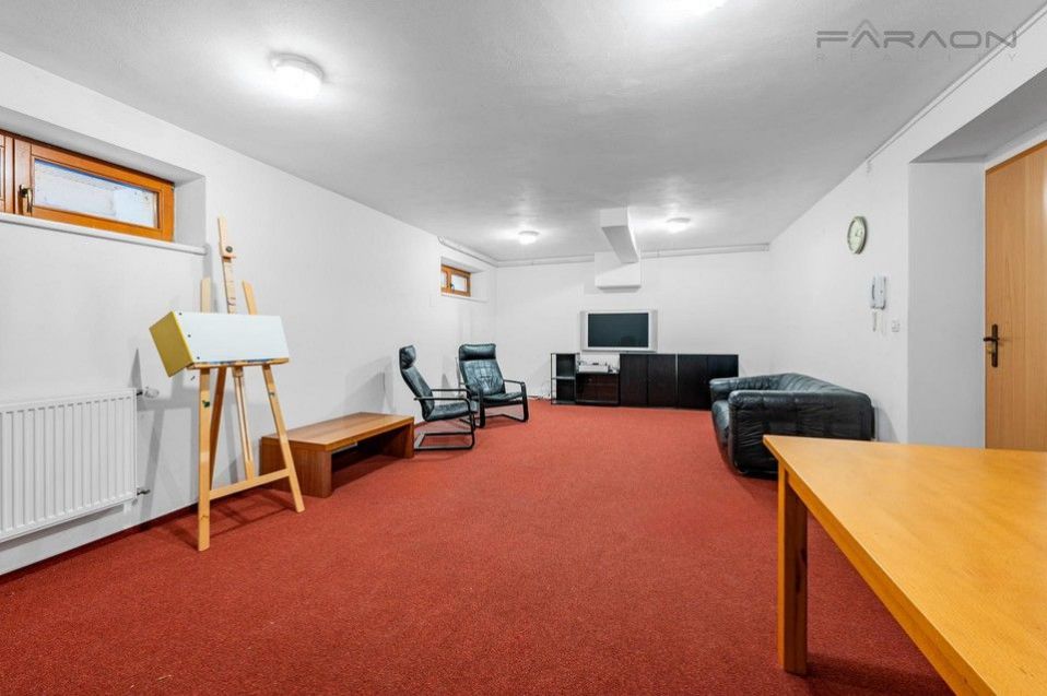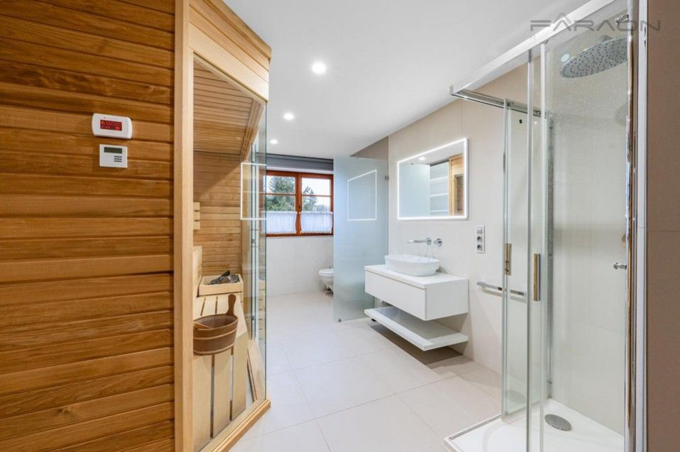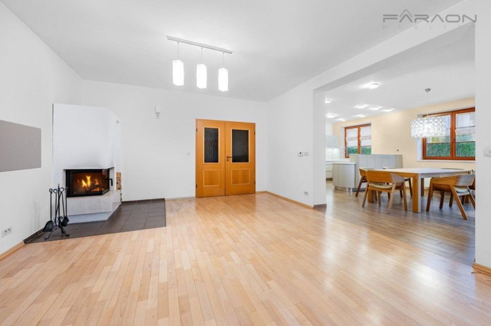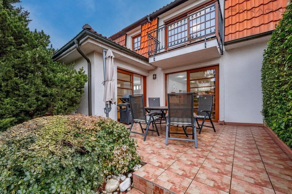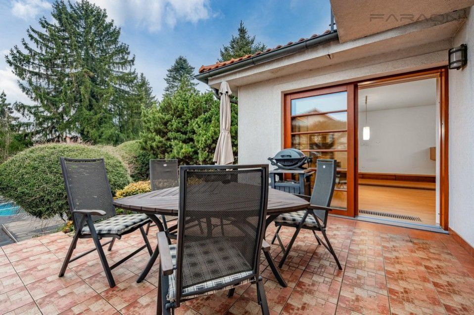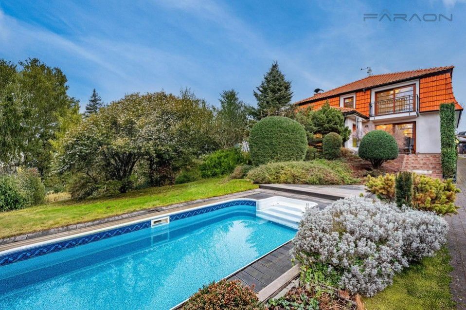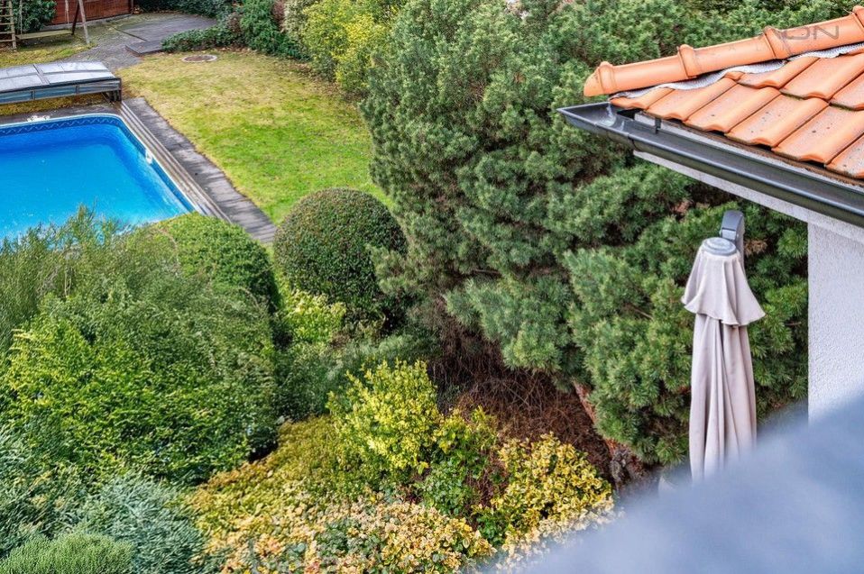 K domu náleží zastřešený bazén, přístavba zahradního domku. K dispozici garáž a možnost dalšího venkovního parkování přímo na pozemku. Dům je obklopený oplocenou krásnou, udržovanou zahradou a automatickým zavlažováním.