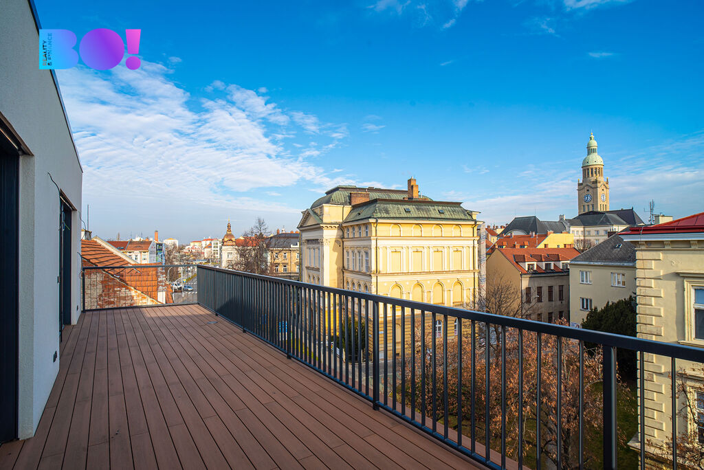 - Terasa 20 m² s posezením a nádherným výhledem na městskou věž a historické centrum.