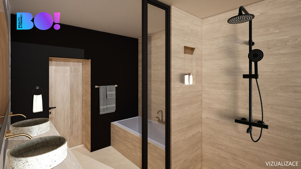 - V koupelnách navrženo designové obložení Barrisol, které dodává luxusní atmosféru.