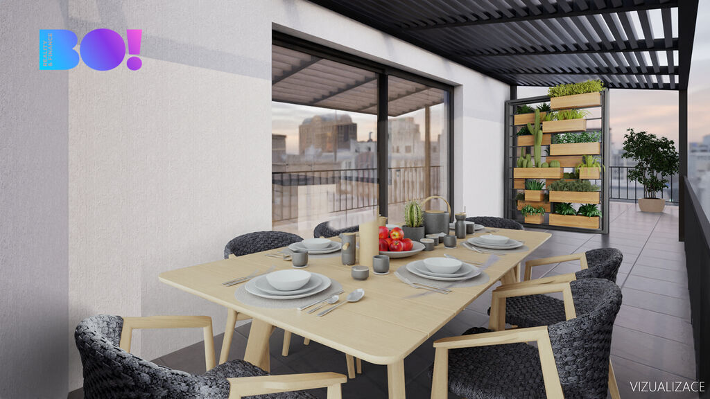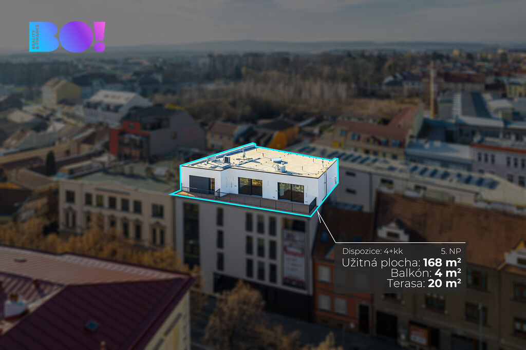 Penthouse o dispozici 4+kk nabízí celkovou užitnou plochu 168 m², do které náleží: